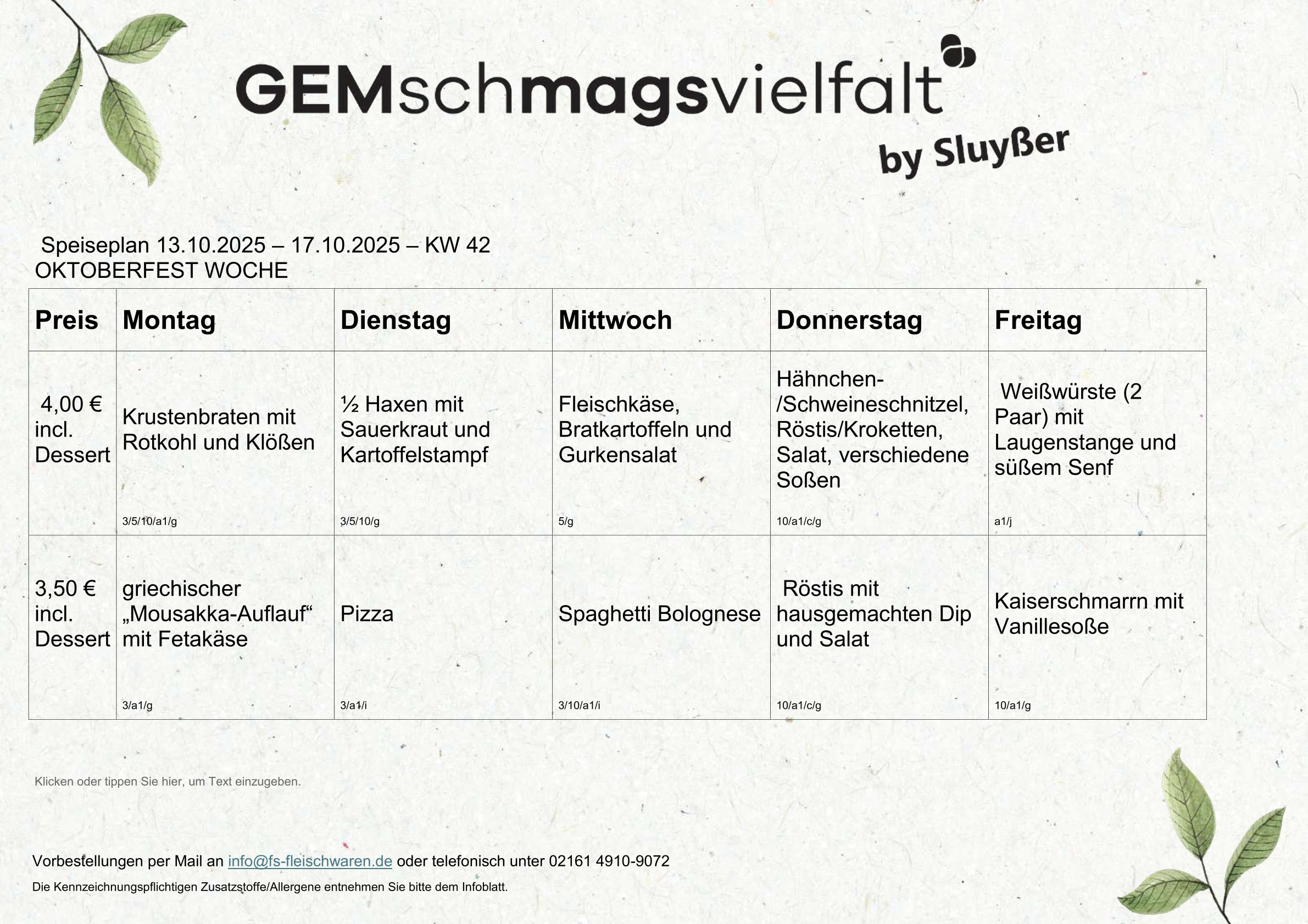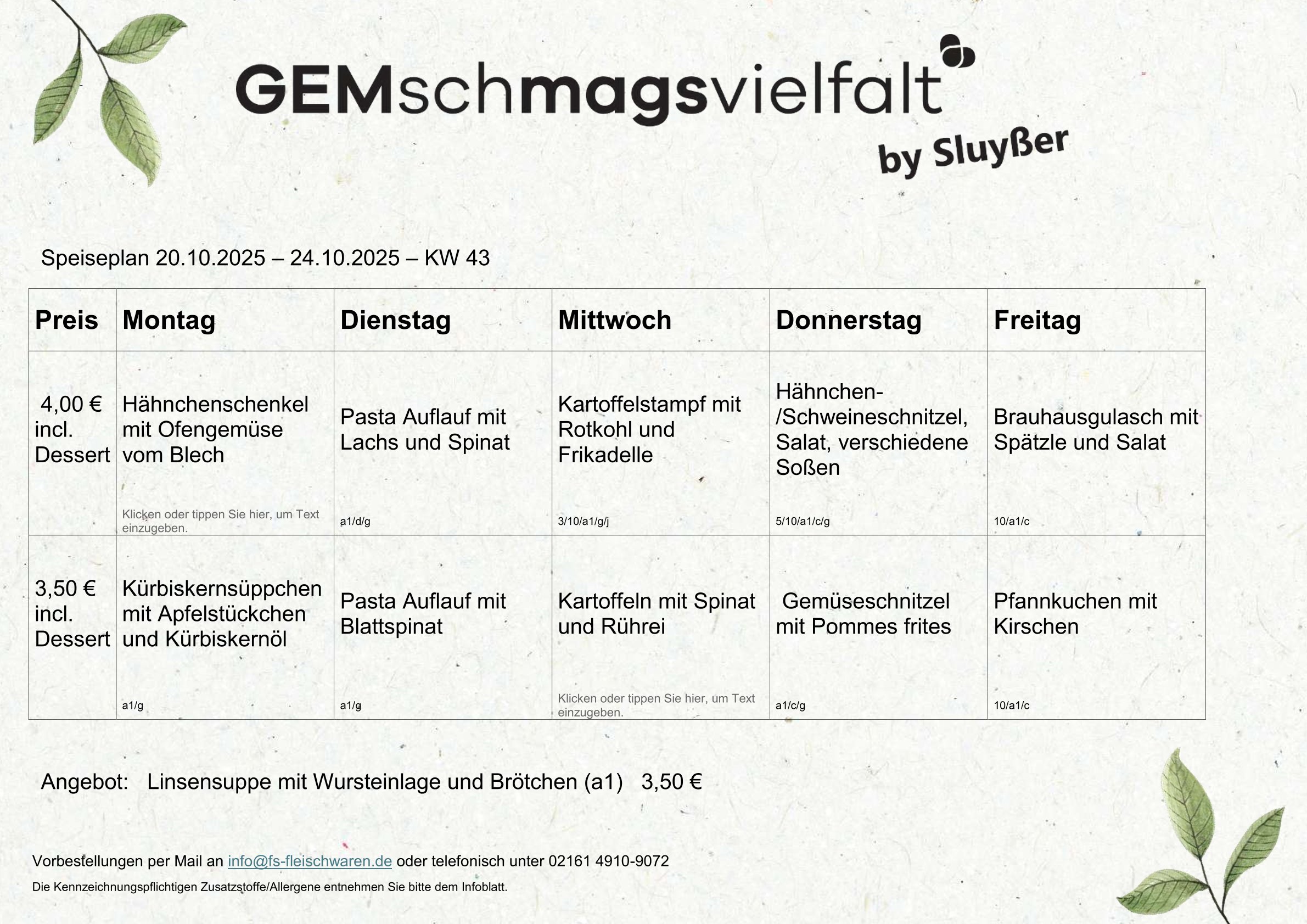 - täglich wechselnde Mittagsgerichte in zwei verschiedenen Varianten: